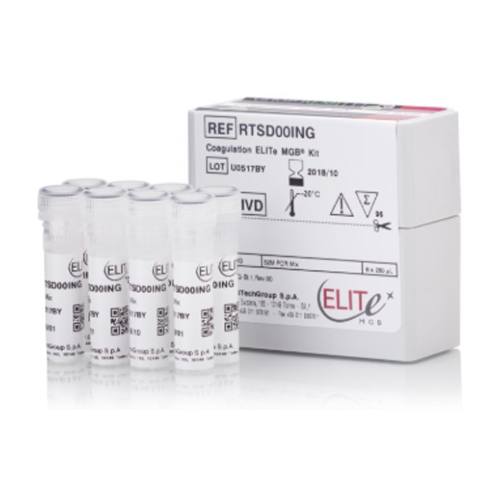 Los genes del Factor V, Factor II y Metileno Tetrahidrofolato Reductasa (MTHFR) están involucrados en el sistema de coagulación. Las variantes de polimorfismo de un solo nucleótido (SNP) de esos genes están asociadas con un mayor riesgo de trombosis y embolias. La detección de variantes mediante pruebas genéticas es importante en pacientes con hipercoagulabilidad para proporcionar una terapia adaptada. El producto Coagulation ELITe MGB® Kit es un ensayo cualitativo de ácidos nucleicos mediante PCR en tiempo real para la distinción de los alelos de los tres locus siguientes en muestras de ADN genómico humano extraído de muestras clínicas de sangre recogida en EDTA:
