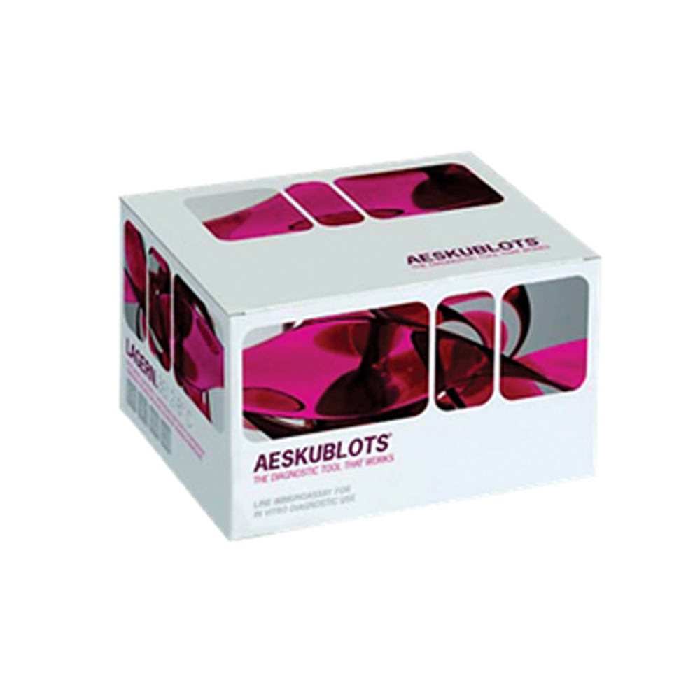 AESKUBLOTS ANA-17 es un inmunoensayo de membrana para la detección cualitativa de anticuerpos IgG contra 17 antígenos ANA clave (como dsDNA, SmD1, SS-A, SCL-70 y Mi-2) en suero o plasma humano.